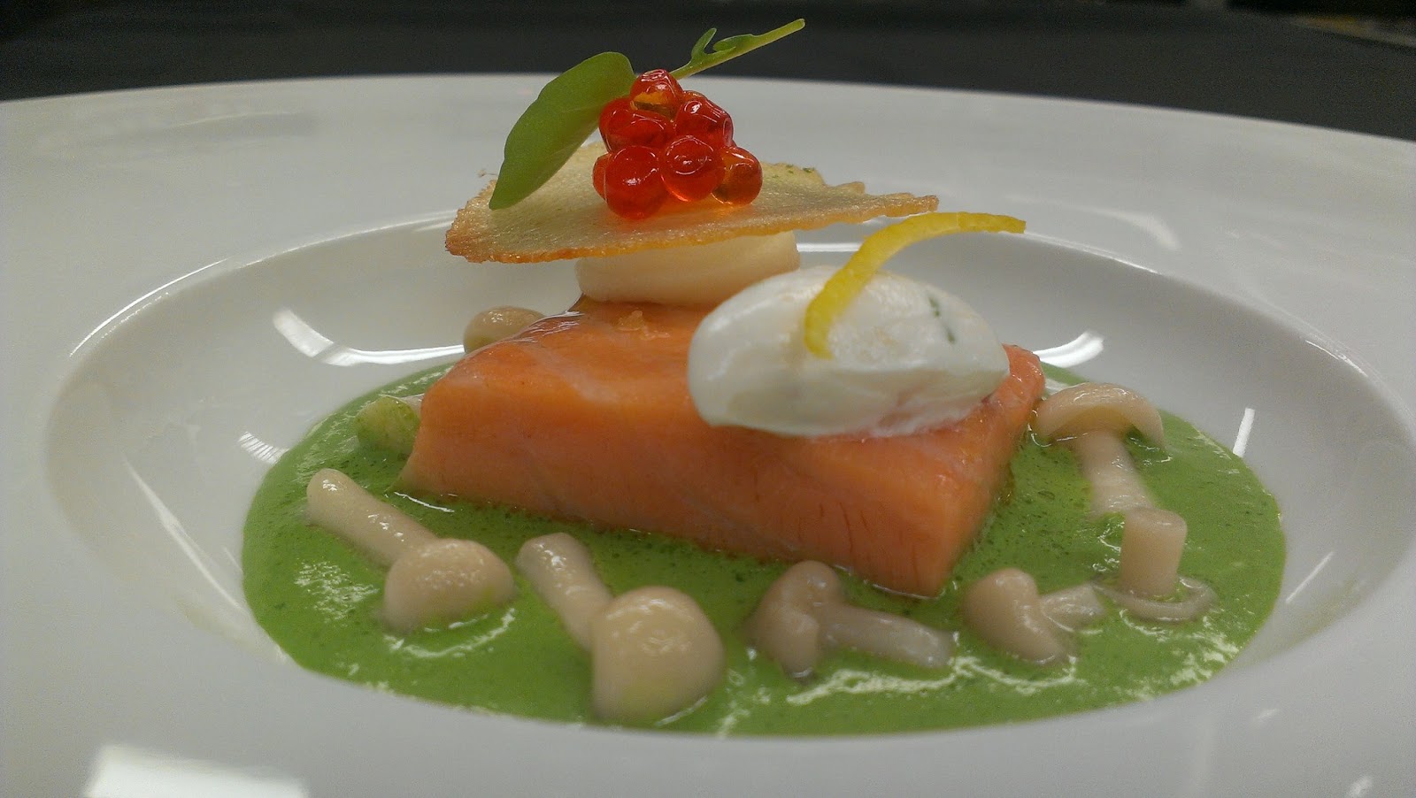 Clean and prepare artichokes for making a soup. In a rondo sweat artichokes, garlic and onions in butter until onions are tender. Deglaze with white wine and reduce until the mixture is dry. Season while you go. Add chicken stock and reduce to a glaze and repeat the process twice. Add enough stock just to cover the mixture, zest from one lemon and 100 grams of chopped parsley bring to a simmer and 500 grams of cream and bring back to a simmer adjust seasoning and acid with lemon juice. Blend the soup and pass threw a chinois and pour into an ISI canister. Charge 3 times shaking well after each charge and keep warm. We present the “soup” in the ISI canister tableside.
